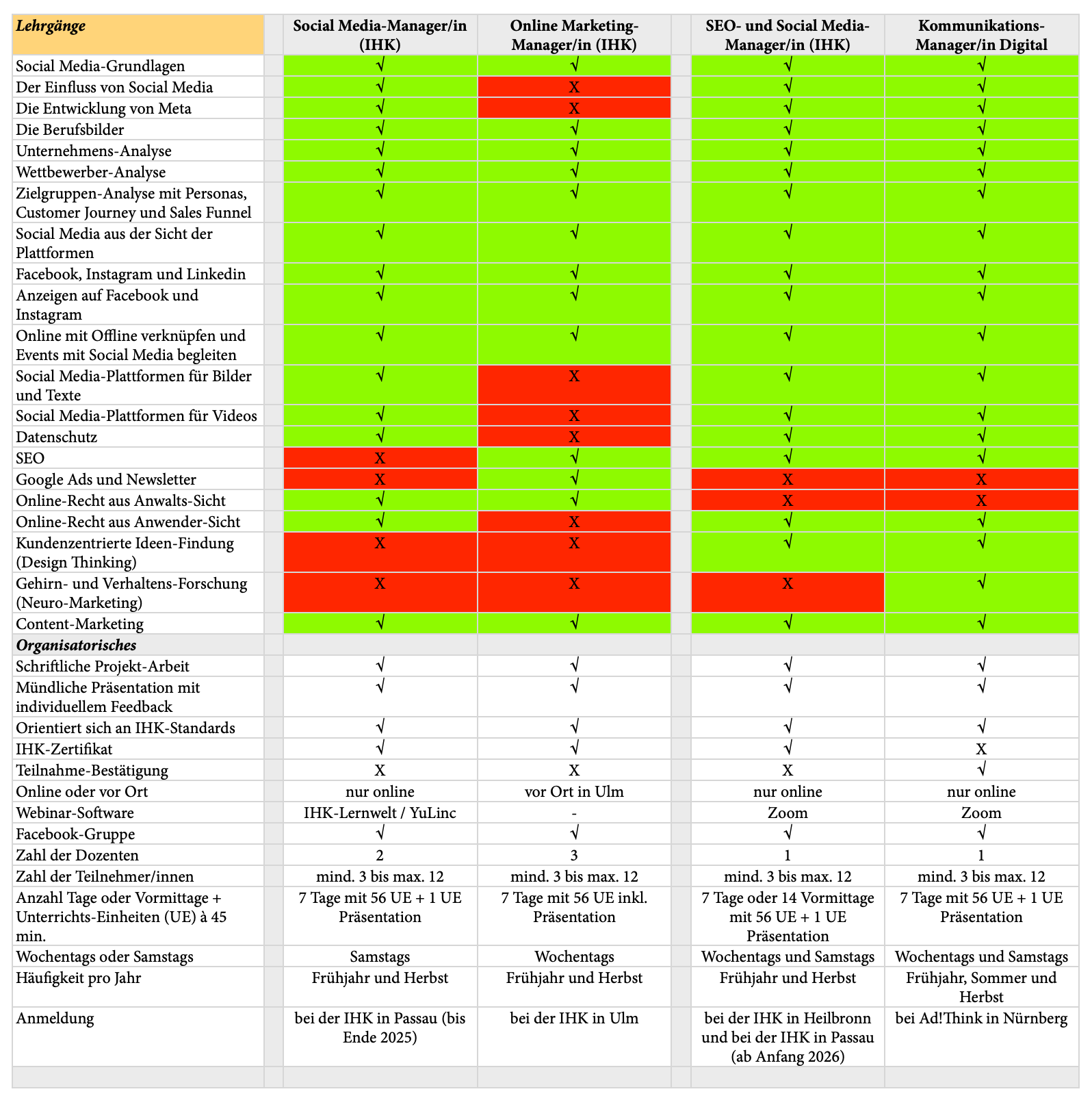 - Im Bereich "Online- und Social Media-Marketing" berate ich mittelständische Unternehmen schon seit Sommer 2006 und seit Herbst 2018 habe ich in unterschiedlichen IHK-Lehrgängen bereits über 200 Projekt-Arbeiten bewertet sowie individuelle Impulse zur Umsetzung und Weiterentwicklung gegeben, wie Sie auf meiner Seite Lehrgangs-Teilnehmer/innen sehen können.