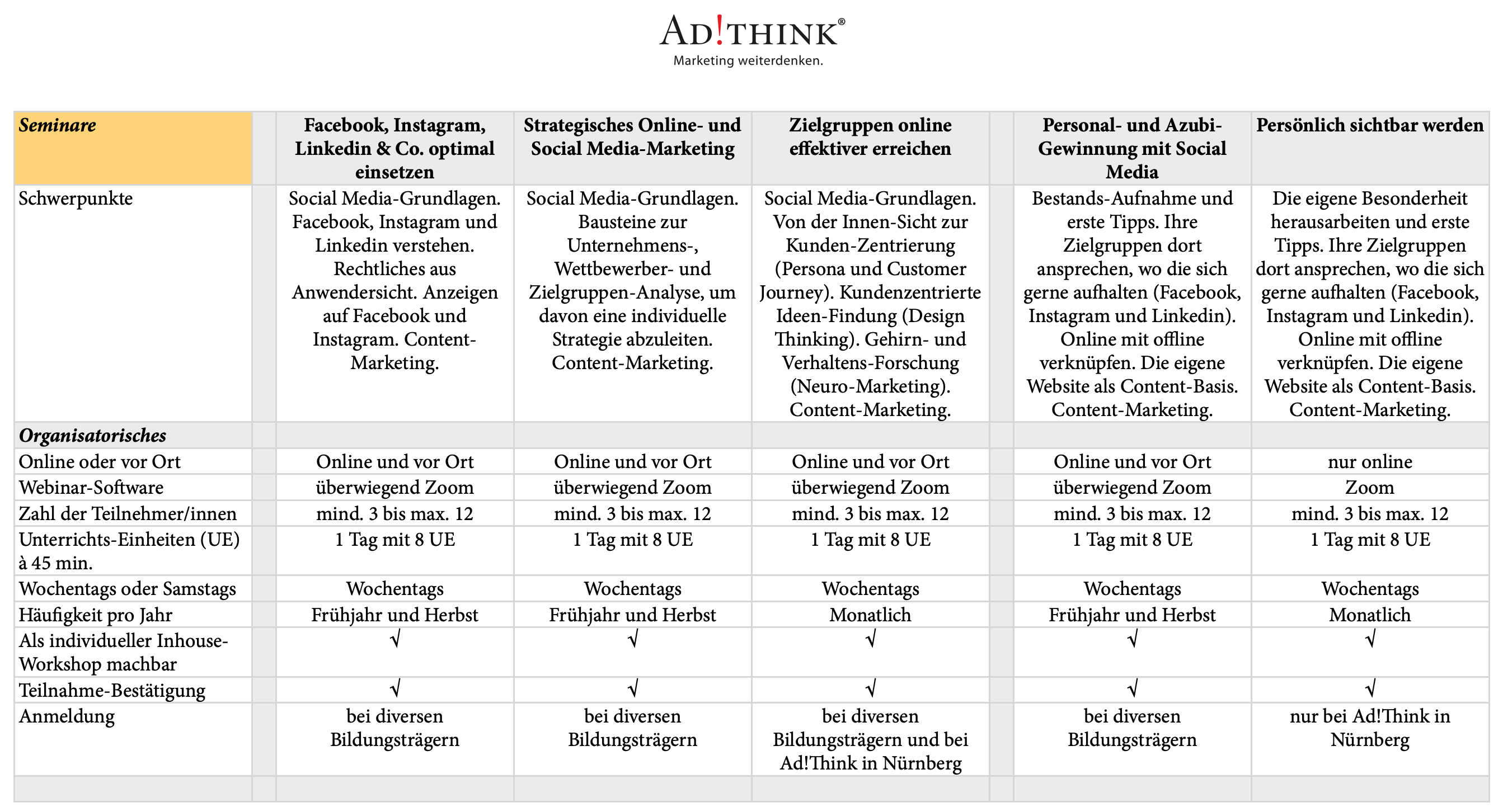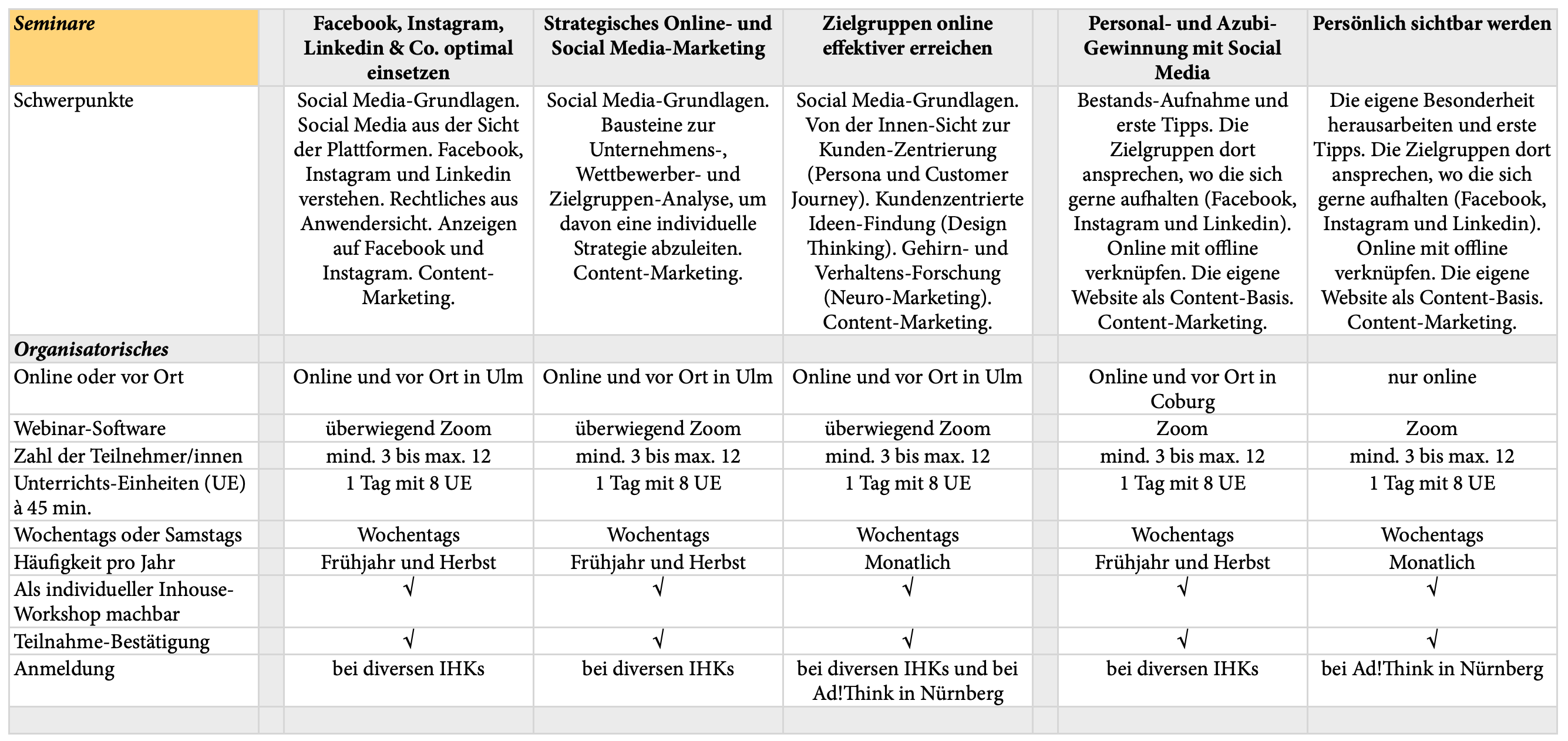 - Die Seminar- und Lehrgangs-Gruppen haben immer mindestens 3 und maximal 12 Teilnehmer/innen, damit ausreichend Zeit ist, um auf alle Ihre Fragen einzugehen.