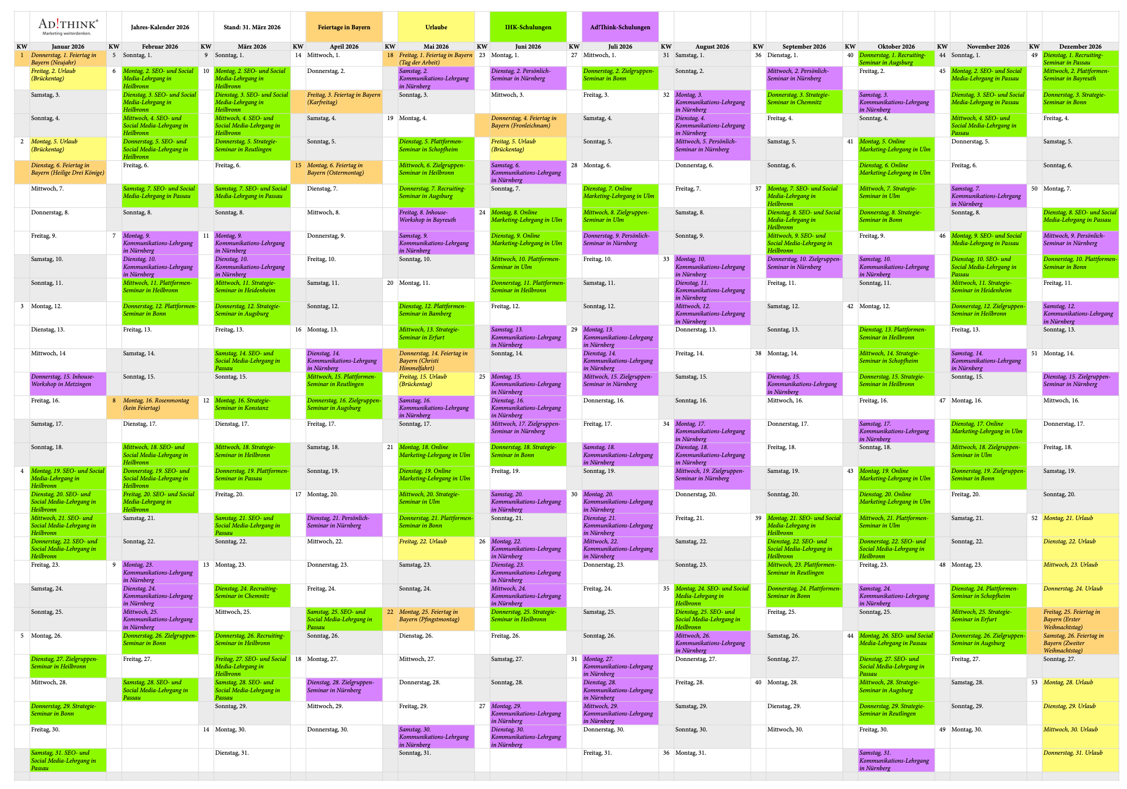 Die - am kursiven Text erkennbaren - Termine sind darüber hinaus Feiertage, meine Urlaube und Schulferien in den Bundesländern, in denen ich unterrichte (Bayern, Baden-Württemberg, Nordrhein-Westfalen, Sachsen und Thüringen).