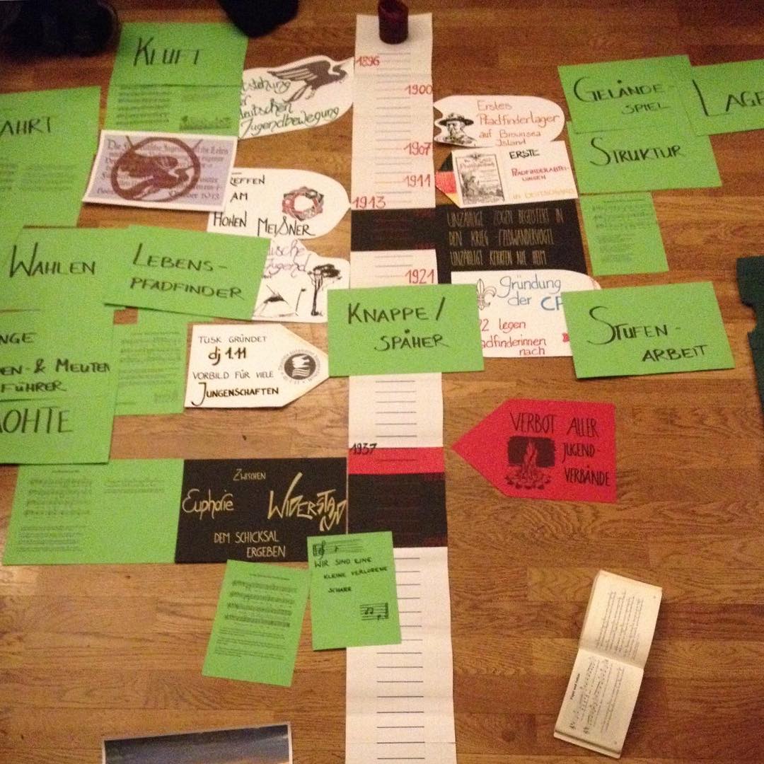 Die hatte ich Anfang 2016 und 2017 bei einer Schulung unterstützt und dort hat jemand an einem Zeitstrahl nicht nur die #pfadfindergeschichte erklärt, sondern auch wann und in welchem Zusammenhang die typischen Elemente der #pfadfinder hinzukamen und welche Lieder aus der jeweiligen Zeit stammen.